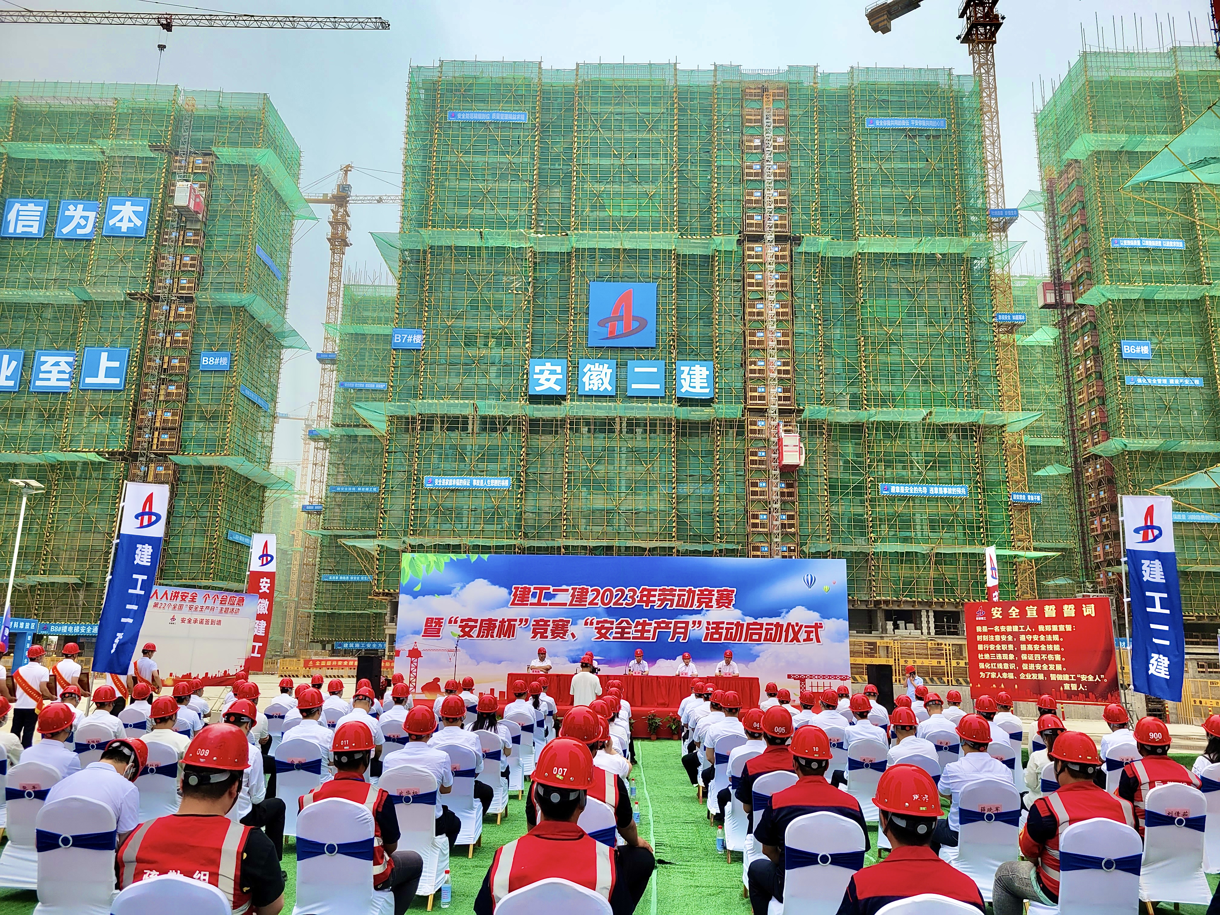 5月30日上午,建工二建在蕪湖中丞濱江時(shí)代項(xiàng)目現(xiàn)場舉行2023年勞動(dòng)競賽暨“安康杯”競賽、“安全生產(chǎn)月”活動(dòng)啟動(dòng)儀式。公司領(lǐng)導(dǎo)班子成員,勞動(dòng)競賽委員會(huì)成員,所屬各單位主要領(lǐng)導(dǎo),分管安全、生產(chǎn)及質(zhì)量副經(jīng)理,工會(huì)(副)主席,工管科、安全科科長,公司工會(huì)、工程管理部、安全管理部、技術(shù)質(zhì)量部相關(guān)人員,受表彰先進(jìn)集體和個(gè)人代表等共百余人參加本次活動(dòng),公司黨委副書記、工會(huì)主席王軍主持啟動(dòng)儀式。
