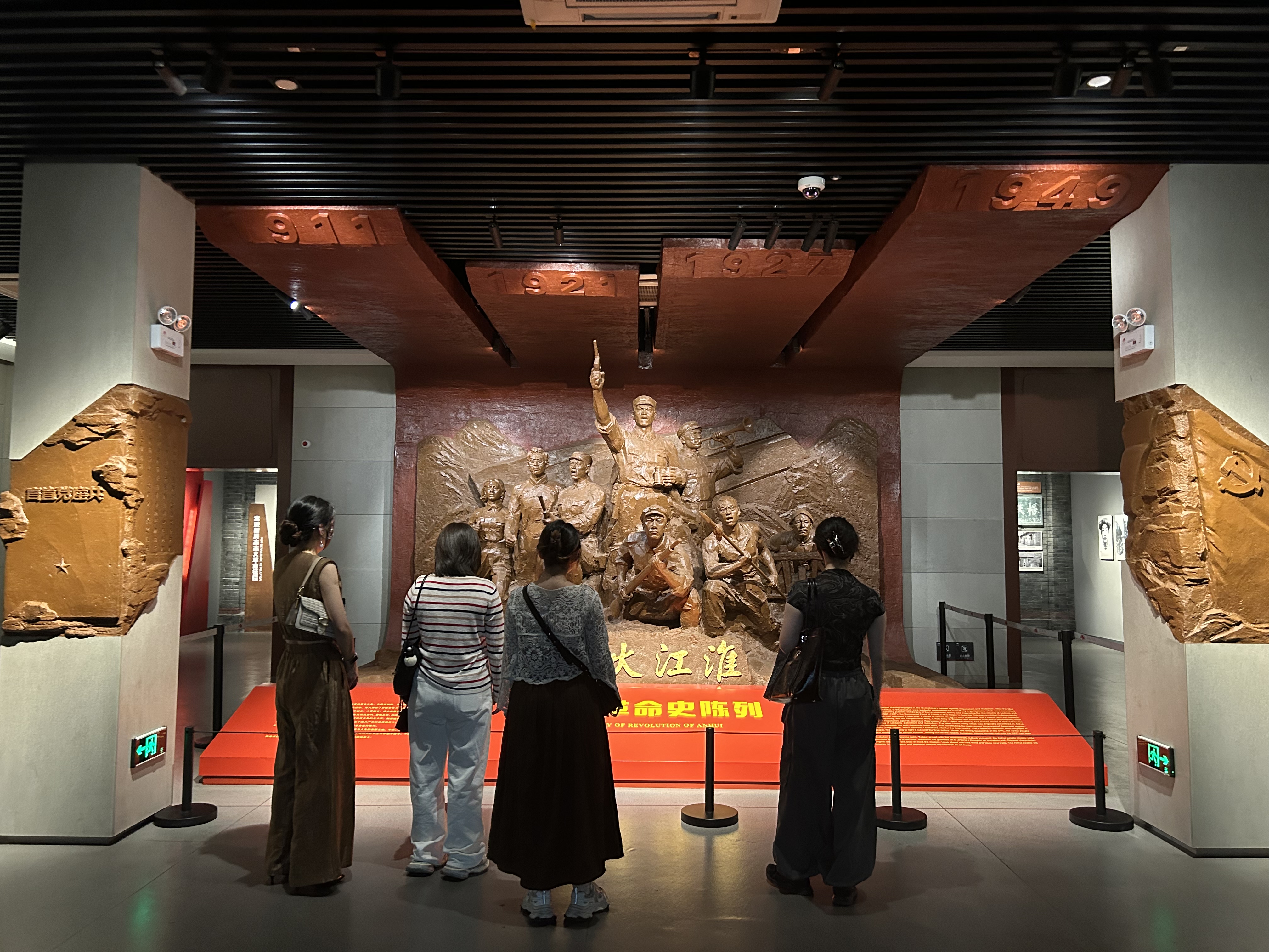 團員青年來到安徽博物院,首先參觀“觀烽火江淮——安徽革命史陳列館”“安徽革命史陳列”分為“革命賡續 安徽建黨”“紅色沃土 紅軍搖籃”“華中砥柱 鐵軍戰歌”“江淮鏖兵 革命勝利”四個部分。展館以實物、歷史照片、多媒體等方式鮮活再現了自“五四運動”后安徽兒女的革命歷史。隨后,團員青年們依次參觀了而今邁步從頭越——紀念毛澤東視察安徽省博物館六十周年、龍行中華——甲辰龍年生肖文物大聯展等展覽。