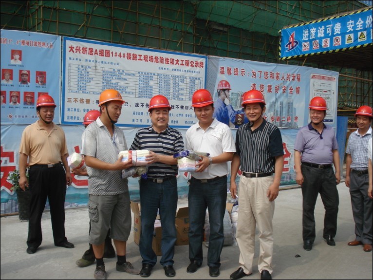 胡董事長在聽取項目部情況匯報之后,向項目部員工表達了最深切的問候,勉勵項目部管理人員要積極開展勞動保護監督檢查,合理安排作息時間,備有充足的防暑降溫用品,力爭為廣大員工提供一個更加舒適的工作生活環境,確保安徽二建安全生產。集團領導還與一線工人親切交談,了解工人們的作息時間和飲食衛生情況,得知工人們中午有足夠的休息時間,宿舍有空調或風扇,伙食衛生,有湯水、涼茶和開水供應等,胡董事長等集團領導非常的滿意。