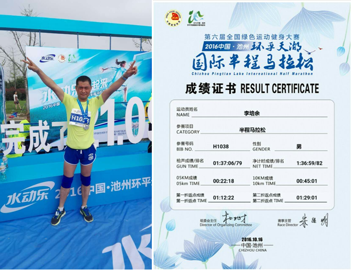 公司職工李培余在日前舉行的2016中國·池州環平天湖國際半程馬拉松比賽活動中,以1:36:59秒的成績跑完21.0975km賽程,在6000多名參賽選手中排名82位,成績驕人。