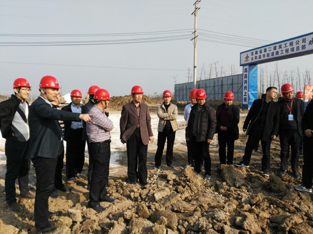 2017年2月15日,集團公司黨委委員、副總經理王厚良、總經理助理、工程管理部主任童宗勝、安全監察局主任殷博、投資公司總經理朱忠明等一行赴安徽二建承建的太和縣經開區現代醫藥產業及發藝產業基礎配套工程PPP項目工程施工現場檢查指導工作。