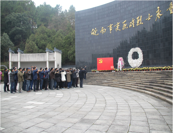 初冬的皖南山區并無太多蕭瑟之感,目之所及,綿延起伏的群山上仍是郁郁蔥蔥,新四軍軍部舊址就位于這綠水青山之間。黨員同志們懷著敬仰的心情先后參觀了新四軍軍部舊址、新四軍軍部大會堂舊址、皖南事變烈士陵園,并敬獻花籃與挽聯。通過講解員的解說,大家了解了新四軍的建立發展壯大過程、軍部主要機關設置、新四軍將領及女兵的英勇抗日的事跡,以及震驚中外的“皖南事變”的經過。豐富而詳實的館藏史料,讓黨員們重溫了中國共產黨領導中國人民取得革命成功的艱辛歷程;同時也深刻認識到只有在中國共產黨領導下,中國的革命事業才會取得不斷勝利。