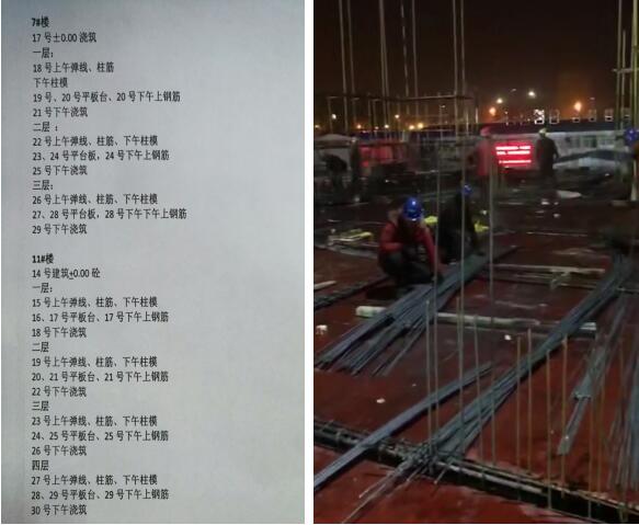 為完成春節前夕項目部7#號樓三層封頂、11#號樓四層封頂任務,二分公司領導班子高度重視,分公司生產副經理孟慶武扎根在一線監督指導。時間緊,任務重是項目部面臨的嚴峻挑戰,在困難面前,項目全體人員沒有退縮,制定了切實可行、精準高效的施工方案。一方面針對班組實行獎懲措施,兩班倒策略,對提前完成計劃任務的班組給與獎勵,對完不成的班組給與處罰。另一方面項目部全程跟蹤精心組織,晝夜奮戰。在項目部全體員工的共同努力下,四天完成一層結構,充分發揚了二建人攻堅克難精神