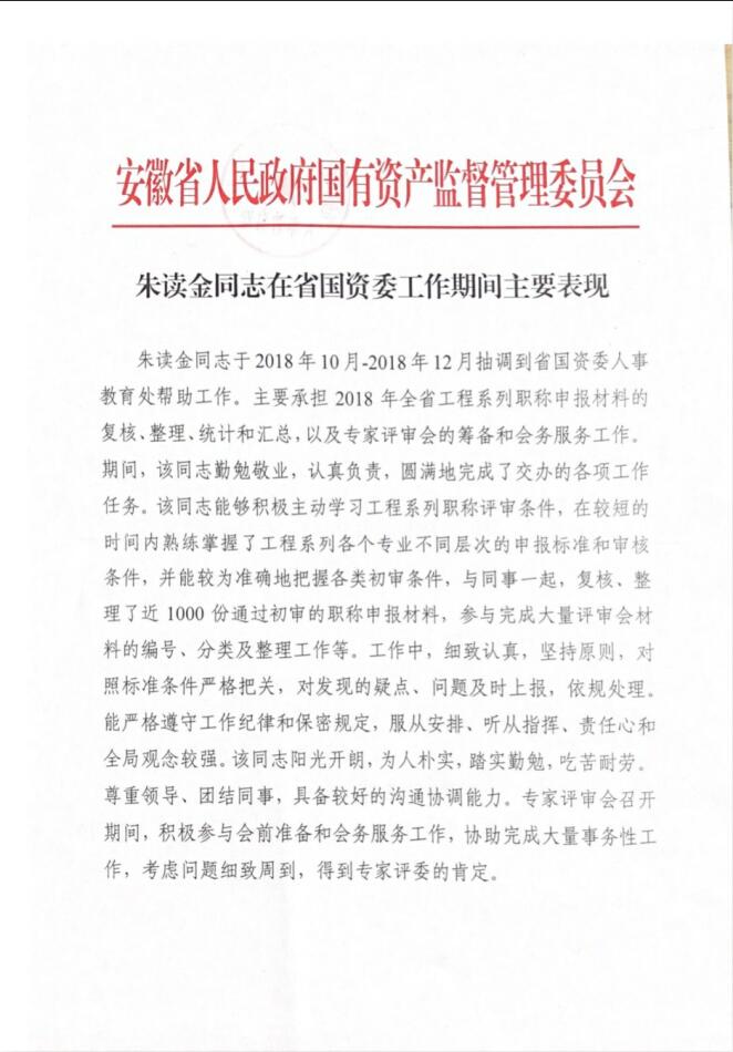 2018年10月-2018年12月被抽調省國資委人事教育處幫工作,周末加班加點,兢兢業業,與國資委同事一審查近1000份職稱申報材料,工作得到專家評委一致肯定。