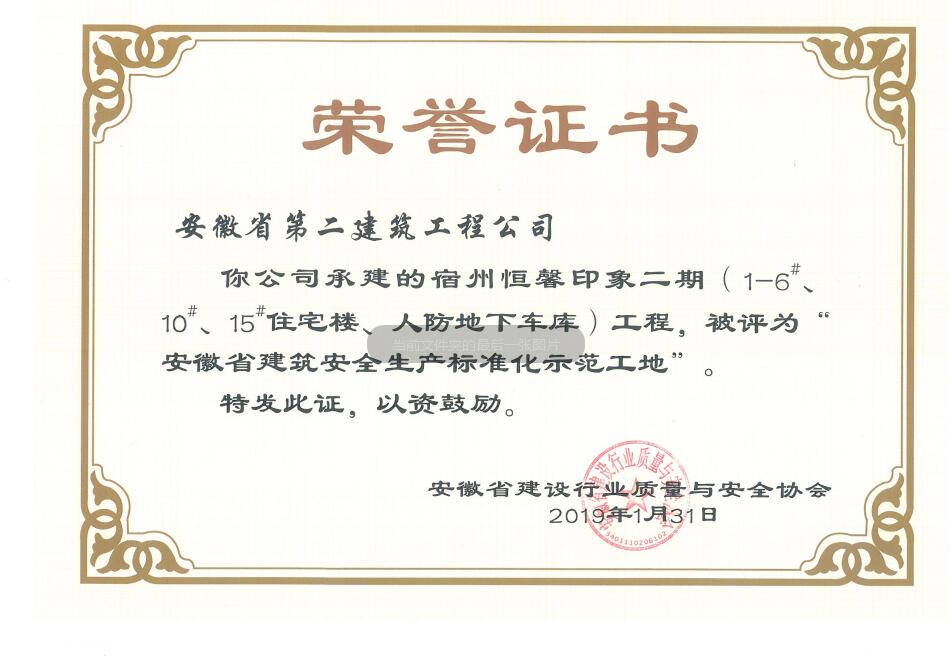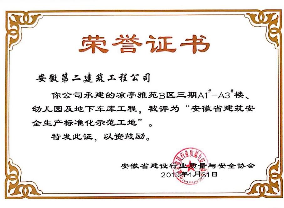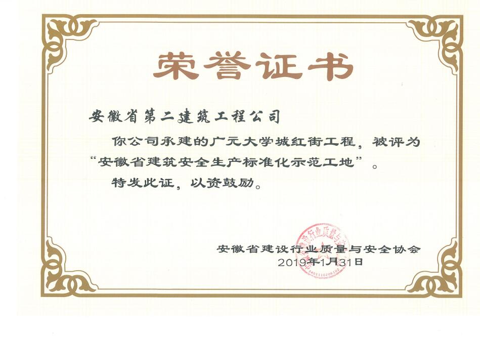 安徽二建公司榮獲2018年度“省級建筑施工安全生產標準化示范工地”稱號