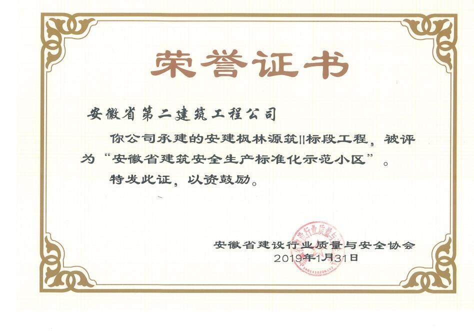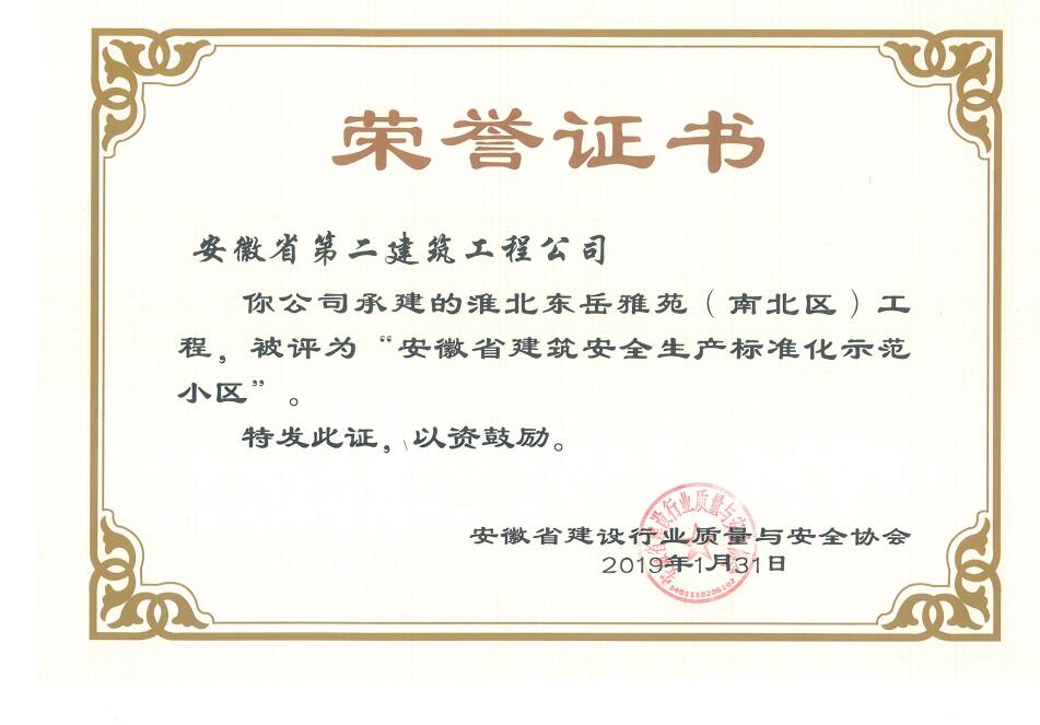 近日,從安徽省建設行業質量與安全協會獲悉,安徽二建承建的肥西涼亭雅苑、阜陽楓林源筑、阜陽廣元大學城、宿州恒馨印象、淮北東岳雅苑5個項目獲得2018年度“安徽省建筑施工安全生產標準化示范工地”稱號,為公司再添榮譽。