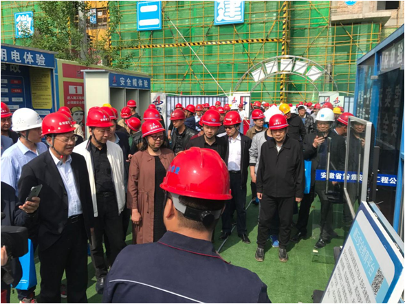 4月24日上午,阜陽市城鄉建設局召開了阜陽市建筑施工揚塵整治、安全生產、質量管理、掃黑除惡、文明創建部署會暨標準化建設現場會。市城鄉建設局黨組書記、局長海闊一行在公司副總經理葉和永、安全總監曹建陪同下蒞臨阜陽廣元大學城紅街工程觀摩會現場。市城鄉建設局副局長、市建管局局長、市工程質監局局長、各縣市區住建局負責同志、安全站(科)長及阜城各在建項目建設單位、施工單位同志等300余人參會。