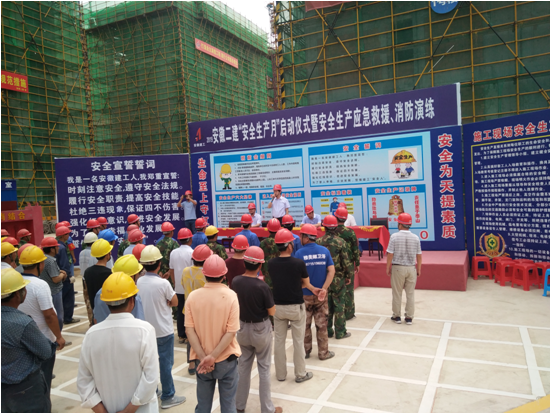 6月16日上午,安全管理部組織、信訪保衛部及后勤綜合服務部協同在五分公司固鎮名邦國際花都項目開展6.16安全咨詢日、安全宣誓、簽名、應急救援演練、職工體檢、安全主題宣講、安全生產經驗交流、安全教育場館體驗、安全宣傳圖牌展覽等一系列“安全生產月”宣傳教育活動,分管安全副總經理葉和永任總指揮,項目部全體管理人員及工人共一百余人參加。