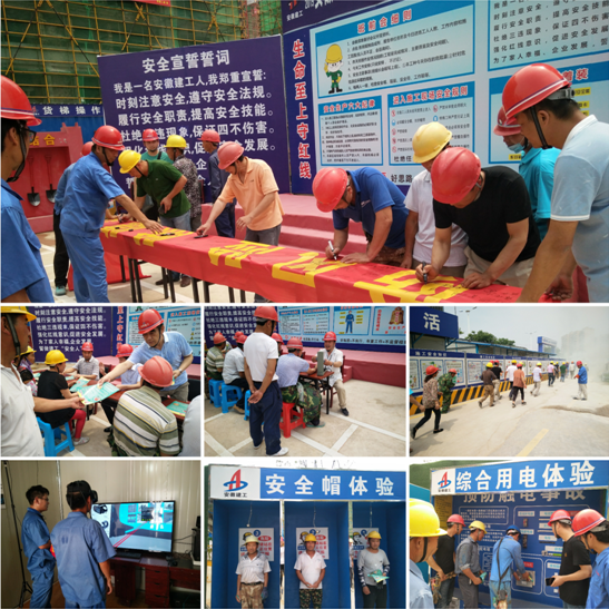 活動當天,共發放安全宣傳資料100余份,接受項目職工咨詢50余人次;開展預防高墜、中暑及火災救援演練;給工友們體檢,告知夏季高溫季節施工注意事項;帶工友們觀看圖片展覽,講解安全生產知識,到安全教育體驗館進行實體和VR虛擬體驗;現場全體人員參與宣誓及簽名活動。現場活動結束后,安全管理部在會議室開展安全主題宣講活動,帶領項目職工學習《安全生產條例》及《建筑安全生產標準化示范工地評價標準》(DB34/T5040-2016),組織項目管理人員開展安全生產經驗交流會,總結工作亮點,查找不足,促進今后工作的順利開展。