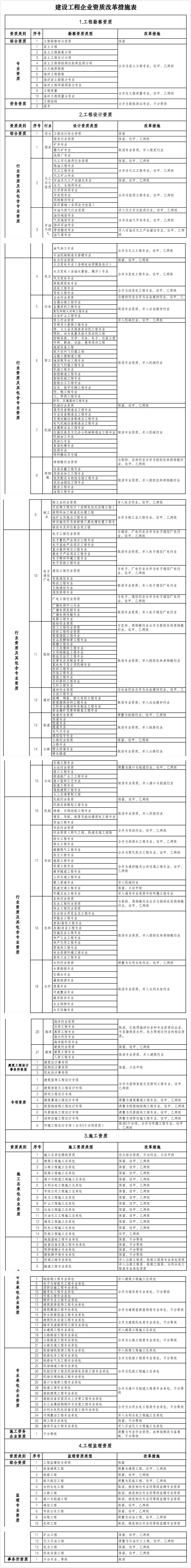 為保持資質管理政策的穩定性和連續性,避免對企業正常生產經營造成干擾,保障工程質量安全,在維持工程勘察、工程設計、施工、工程監理等資質標準框架基本不變的同時,按照“能減則減、能并則并”的原則,大幅壓減企業資質類別和等級。(詳見下文建設工程企業資質改革措施表)對可由市場自主選擇、行業自律進行調節的企業資質類別予以取消。對部分專業劃分過細、業務范圍相近、市場需求較小的企業資質類別予以合并。對部分設置過多的資質等級進行歸并,減少資質層級。