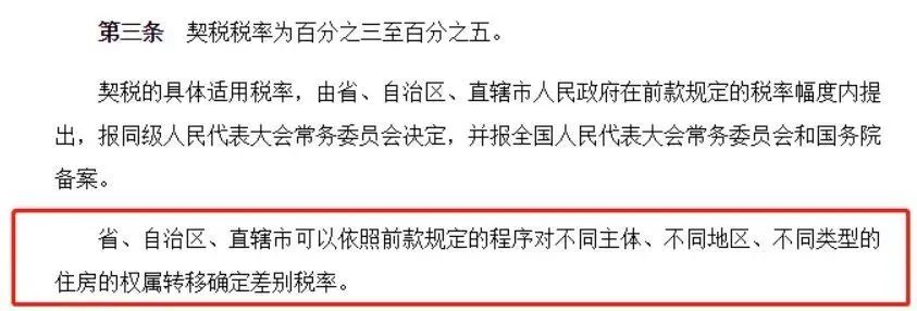 其實,1997年發布的《中華人民共和國契稅暫行條例》中,早已規定契稅稅率為百分之三至百分之五。但各省市可以根據實際情況確定差別稅率。