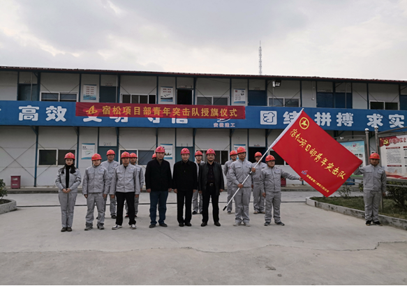 11月20日,宿松項目部結合公司“大干60天”勞動競賽活動熱潮,在公司工會、團委的支持下組建了安徽二建首支“青年突擊隊”,公司工會主席李林、副主席蒯家江、分公司支部書記陳習武應邀參加了“青年突擊隊”授旗儀式并進行授旗。