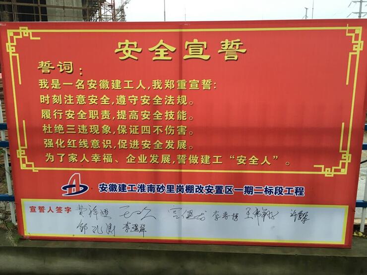 早上六點,清晨第一縷陽光剛剛灑下,項目部管理人員已在安全宣誓牌前排列整齊,面對莊嚴的宣誓牌,全體成員在項目技術負責人王歡的帶領下,右手握拳置于面龐,鄭重地齊聲宣讀誓詞:我是一名安徽建工人,我鄭重宣誓:時刻注意安全,遵守安全法規;履行安全職責,提高安全技能;杜絕三違現象,保證四不傷害;強化紅線意識,促進安全發展;為了家人幸福,企業發展,誓做建工“安全人”。隨后,項目部全體成員在項目經理費祥琪的帶領下,陸續在宣誓牌上簽下了自己的名字,表明自己時刻謹記安全宣誓內容,堅持安全生產的決心。