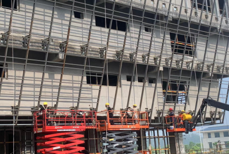 目前,宿州三館一院一中心項目已全面進入到裝飾裝修階段,按照下半年生產目標,項目部針對室內裝修、室外鋪裝、幕墻安裝、鋼網架等工作內容細化階段目標和責任人,每晚組織技術科、施工科與裝修班組、安裝班組召開生產進度分析會,對當天問題及時溝通和解決,保證不耽誤生產進度。