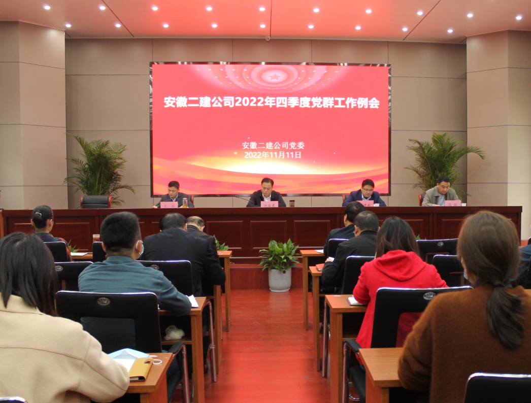 11月11日上午,安徽二建公司召開2022年四季度黨群工作例會。黨委書記、董事長許業勇出席會議并講話,公司領導李建成、王軍、沈壯出席會議,黨群部門人員、所屬各單位黨支部書記、工會主席、團支部書記、綜合辦負責黨務工作人員參會。會議由王軍主持。